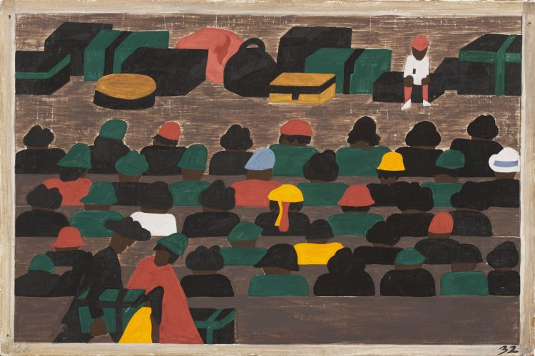 The railroad stations in the South were crowded with people leaving for the North by Jacob Lawrence