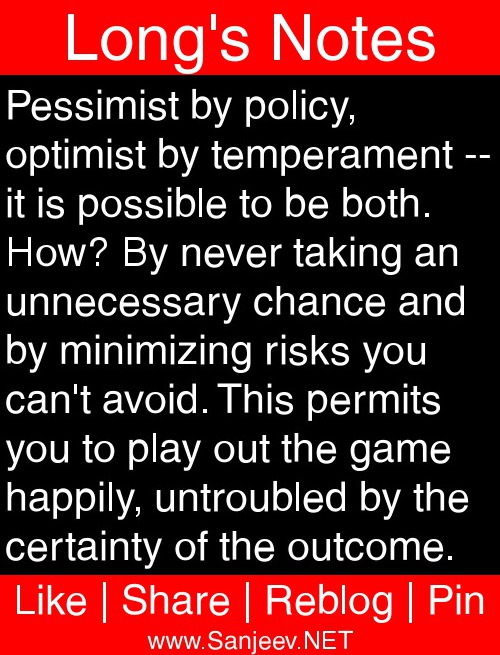 Pessimist by policy, optimist by temperament -- it is possible to be both. How? By never taking an unnecessary chance and by minimizing risks you can't avoid. This permits you to play out the game happily, untroubled by the certainty of the outcome.